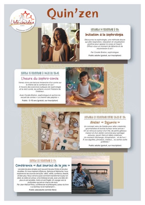 La Quin’zen se déroulera du vendredi 14 au samedi 22 novembre 2025. Elle propose une série d’activités pour se ressourcer, prendre soin de soi, partager de bons moments et retrouver la zen attitude. Un programme tout en douceur