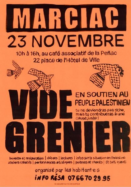 Le dimanche 23 novembre 2025 au café associatif de la Peñac à Marciac, nous organisons un vide grenier, dont l’entièreté des fonds sera reversée à l’Association des Agronomes Arabes, qui porte plusieurs projets dont « Urgence Gaza, urgence Palestine », co-fondé avec l’AFPS (Association France Palestine Solidarité) qui fait de la distribution de paniers alimentaires, de produits d’hygiène et l’achat de citernes d’eau.